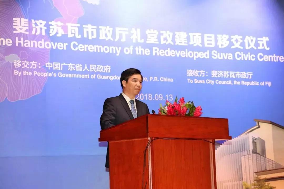 9月13日下午,由广东省援建、南粤集团承建的斐济苏瓦市政厅礼堂改造项目交接仪式在苏瓦市举行。中共中央政治局委员、广东省委书记李希,中联部副部长郭业洲,广州市委副书记、市长温国辉,中国驻斐济大使钱波,斐济地方政府部、住房和环境基础设施和运输部部长Parveen Kumar,苏瓦市政府首席行政官Bi Jay等出席交接仪式。